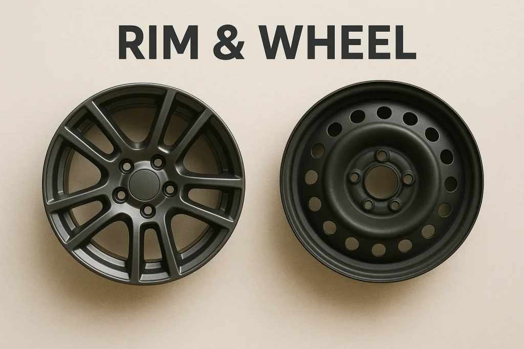 A “rim” is the outer edge of the wheel that holds the tyre, while the “wheel” is the entire metal assembly (rim + hub + spokes + centre).